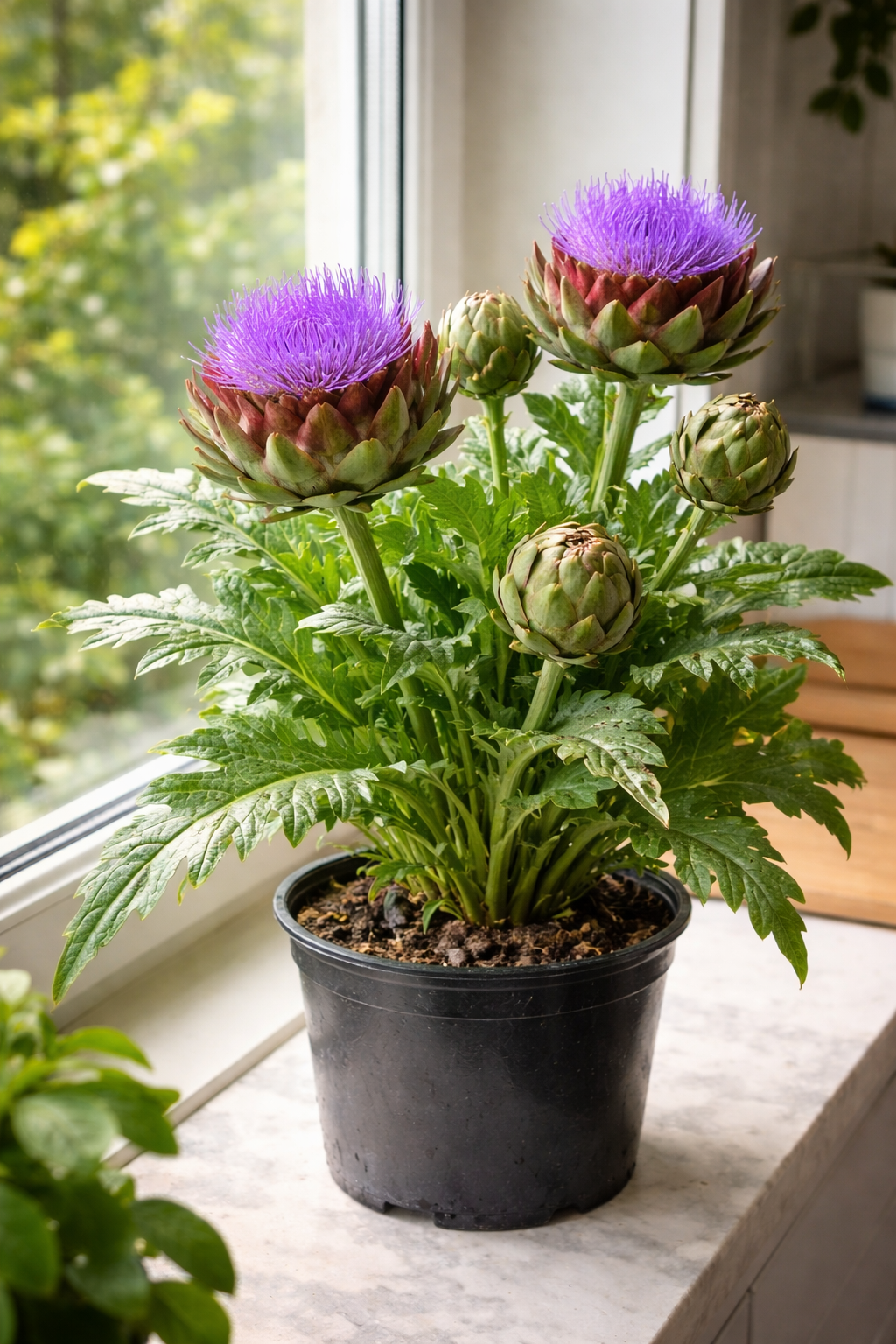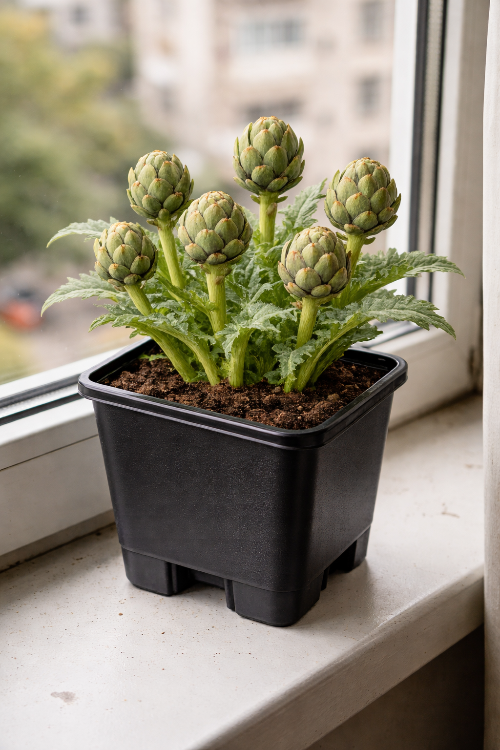 Поставте горщик Р9 у добре освітлене місце — підвіконня або засклений балкон. Артишок любить світло і стабільну температуру.