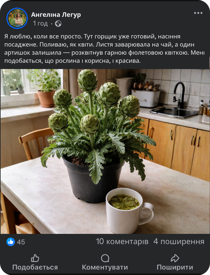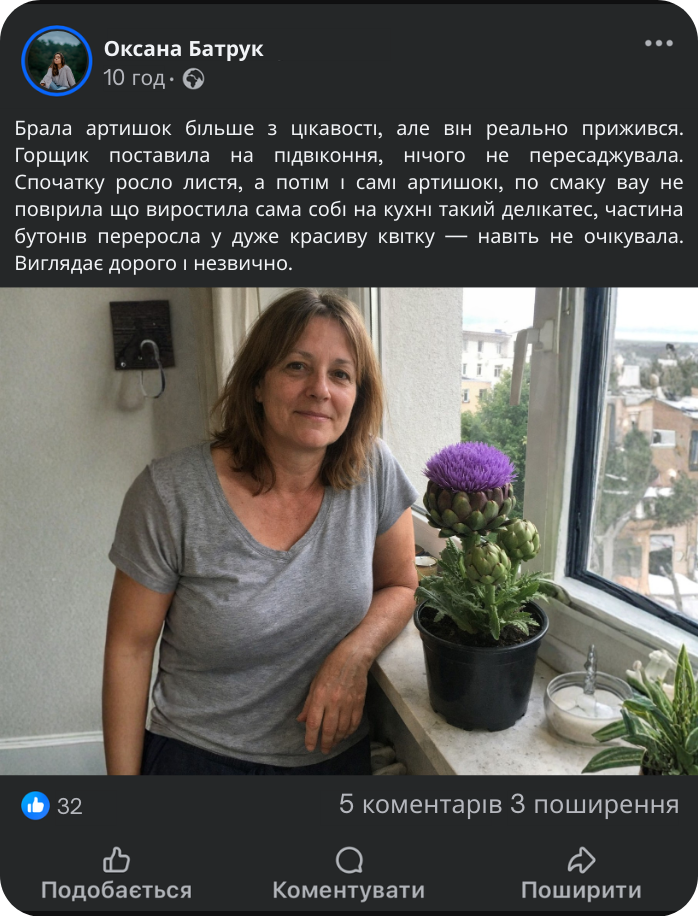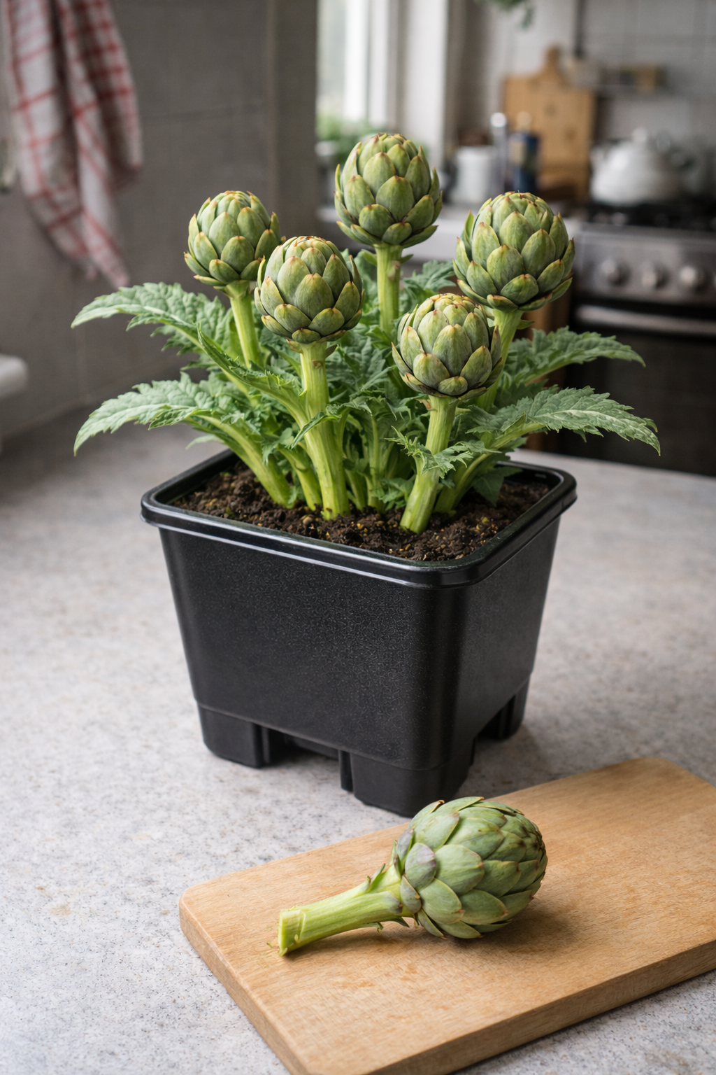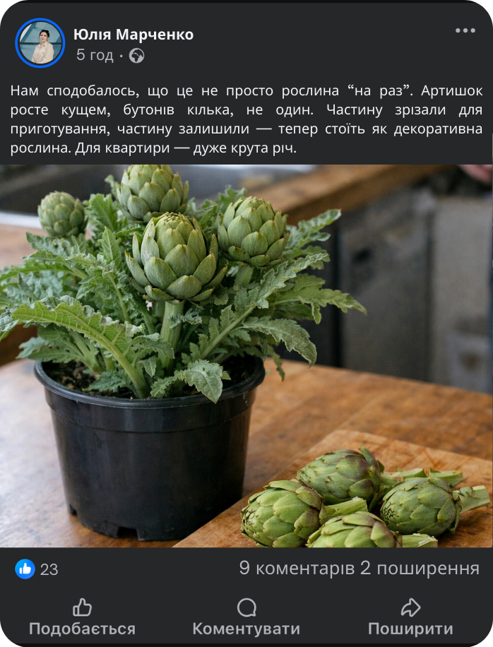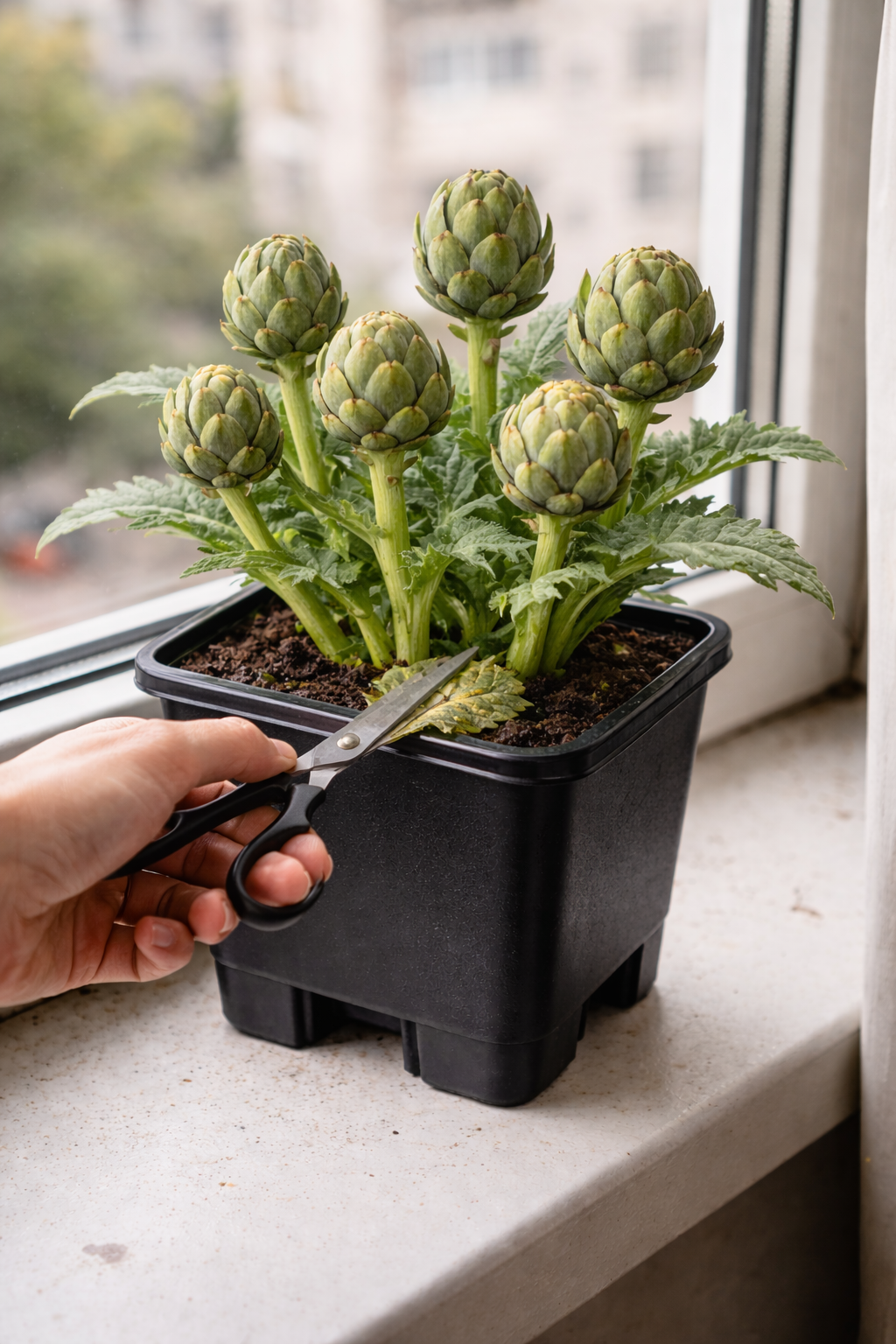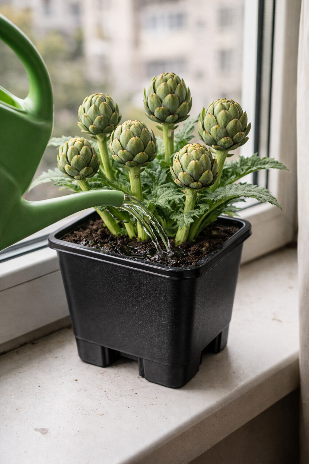 Після отримання горщика достатньо поставити його на світле підвіконня і підтримувати помірний полив. Рослина не зазнає стресу від пересадки, швидко адаптується і починає рости у звичних домашніх умовах. Це зручне рішення для тих, хто хоче вирощувати артишок вдома без досвіду, складних інструкцій і зайвих дій.