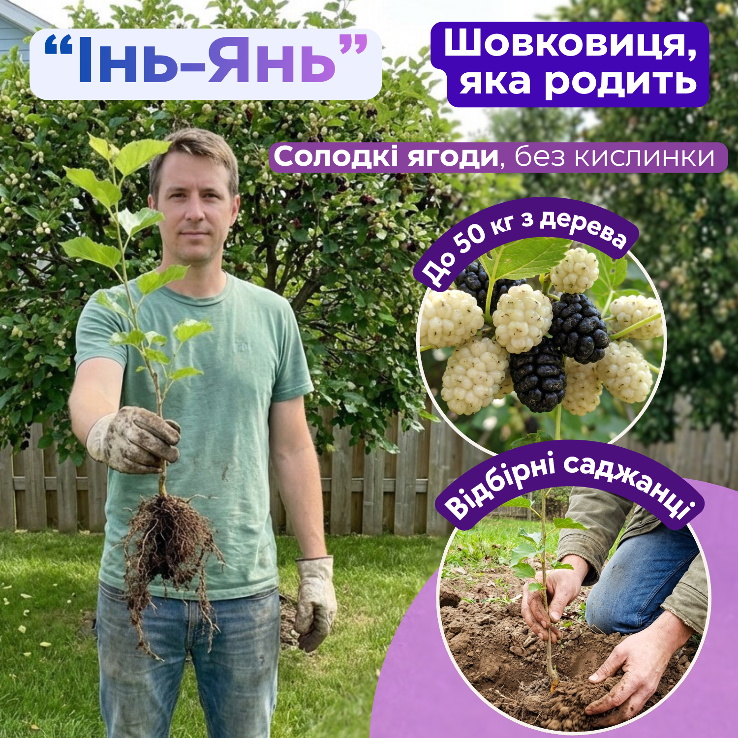 Перші ягоди шовковиці “Інь-Янь” з’являються тоді, коли деревце добре прижилось і набрало сили. Але головне — це не “дика шовковиця з узбіччя”, яка може роками не давати нормального результату. “Інь-Янь” — відібраний садовий сорт, тому ви садите дерево під урожай, а не “щоб просто росло”.